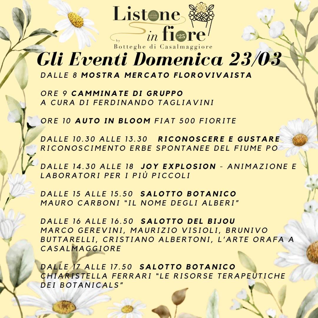 Le Invasioni Botaniche, Crema Fiori e Sapori, Soncino Borgo Fiorito e Listone in fiore sono il titolo per la città di Cremona, di Crema, di Soncino e di Casalmaggiore degli eventi dedicati al florovivaismo, ai frutti della terra e all’artigianato creativo green che vanno in scena: a Cremona il 12 e 13 aprile ed alla vigilia dell’autunno il 27 e 28 settembre, a Crema il 3 e 4 maggio ed il 4 e 5 ottobre, a Soncino sabato 10 e domenica 11 maggio e per la seconda volta a Casalmaggiore il 22 e 23 marzo.