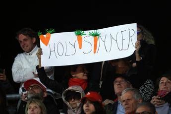 Sugli spalti sono apparsi, come nei precedenti match dell’azzurro, diversi cartelloni. Una ragazza suggeriva la dieta perfetta: “Sleep, eat, tennis. Repeat. Go Jannik”, ovvero “Dormi, mangia, tennis. Ripeti. Vai Jannik”. Un bambino invece aveva in mano il cartellone: “Sinner ottavo re di Roma”, mentre un altro ha avuto un’ispirazione ‘papale’: “Habemus Sinner!”, e ancora “Holy Sinner”, ovvero “Santo Sinner”.