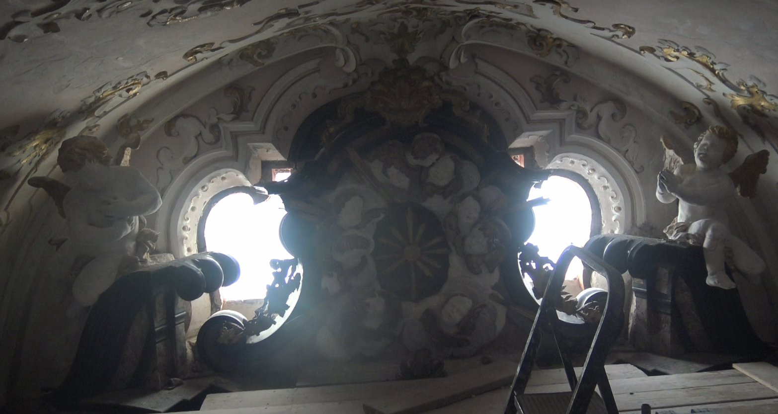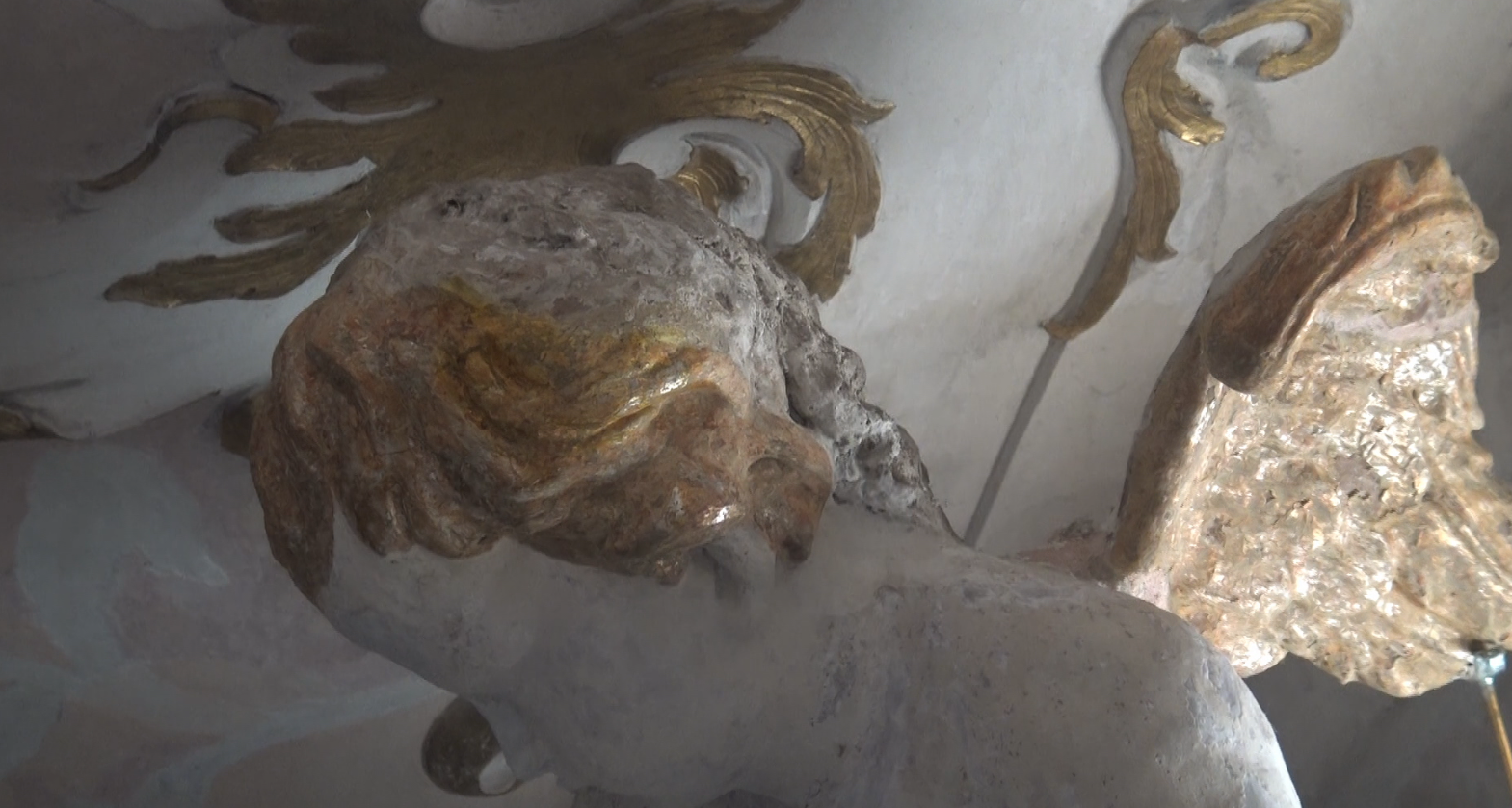 La luce del sole che filtra sulla parte superiore della cappella, raggiungibile dal ponteggio a due piani, consente di notare la cromatura dei risvolti dorati. “Molto interessante è inoltre la tecnica – spiega Damiano Chiarini, intervistato per CR1 – della meccatura, che consente di colorare in oro una base argentata. Accade in particolare sui capelli e sulle ali degli angeli che abbiamo restaurato”.