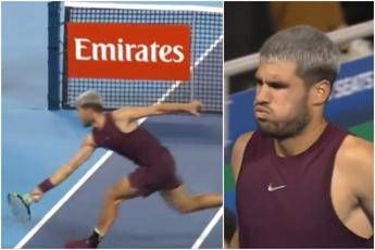 Nel corso dell’ultimo game del match, sul 5-4 nel secondo set, Alcaraz gioca un rovescio che colpisce la linea di fondo e a cui Nakashima risponde con una corta. Lo spagnolo si impegna e ci arriva, stringendo la sua traiettoria con una contro smorzata in diagonale. Lo statunitense non si arrende e fa a sua volta una smorzata che riporta Alcaraz nella stessa posizione.