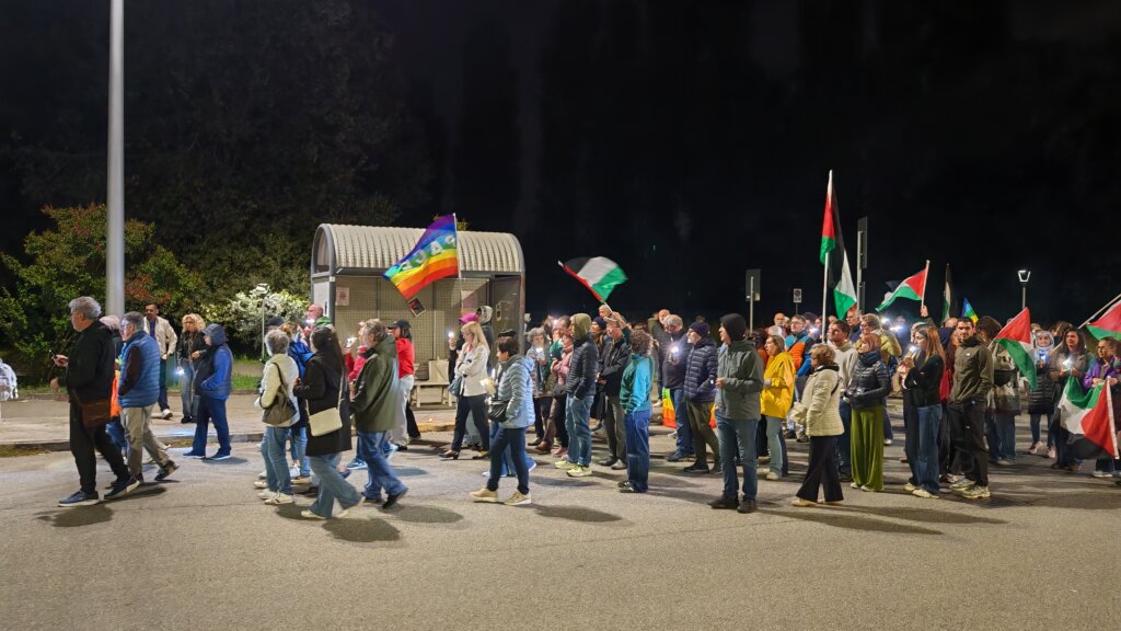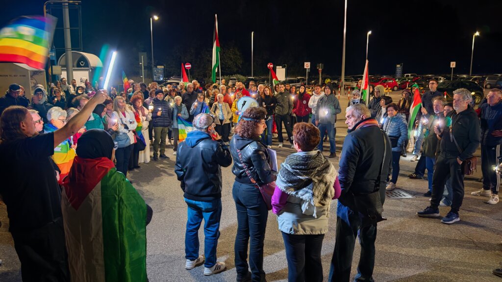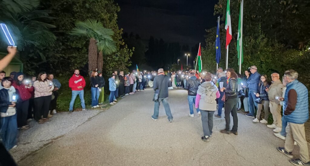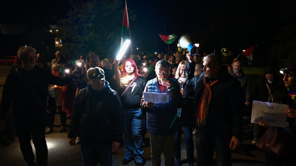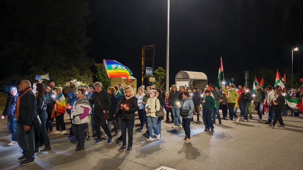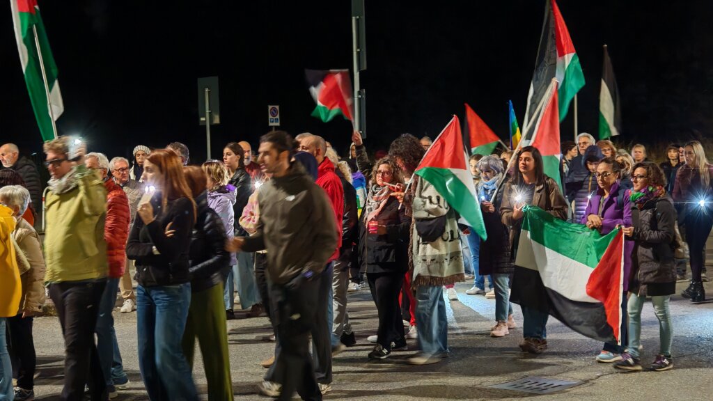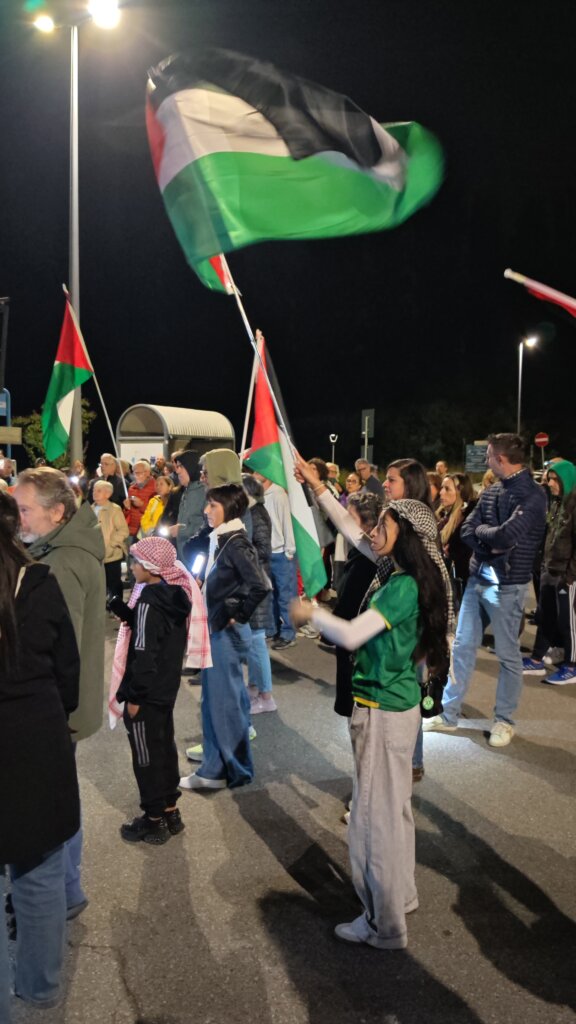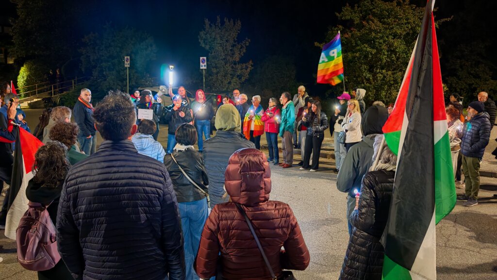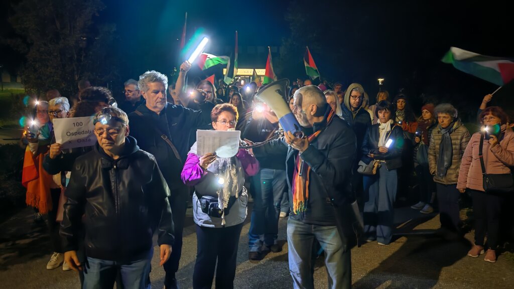 La manifestazione era stata programmata da qualche giorno: il caso (o meglio la cronaca) ha voluto che venisse realizzata proprio poche ore dopo lo stop imposto – in acque internazionali – alla Global Sumud Flottilla, con una cinquantina di imbarcazioni che volevano portare aiuti a Gaza ma sono state fermate dai militari israeliani. Ciascuno ha fatto luce come è riuscito: con torce, con un cellulare, con caschetti da minatore adattati per l’occasione.