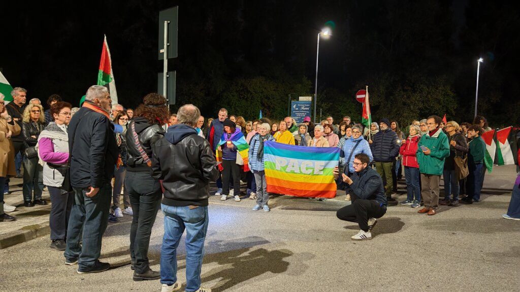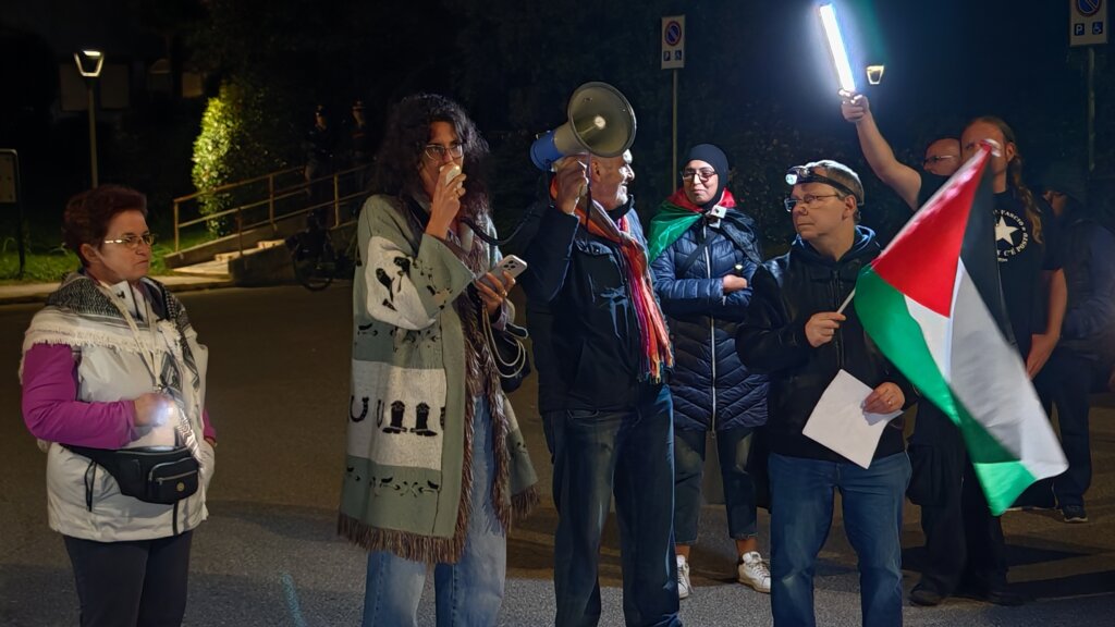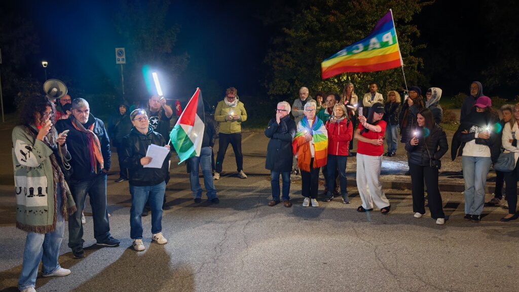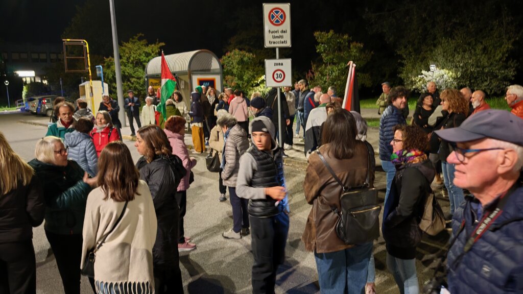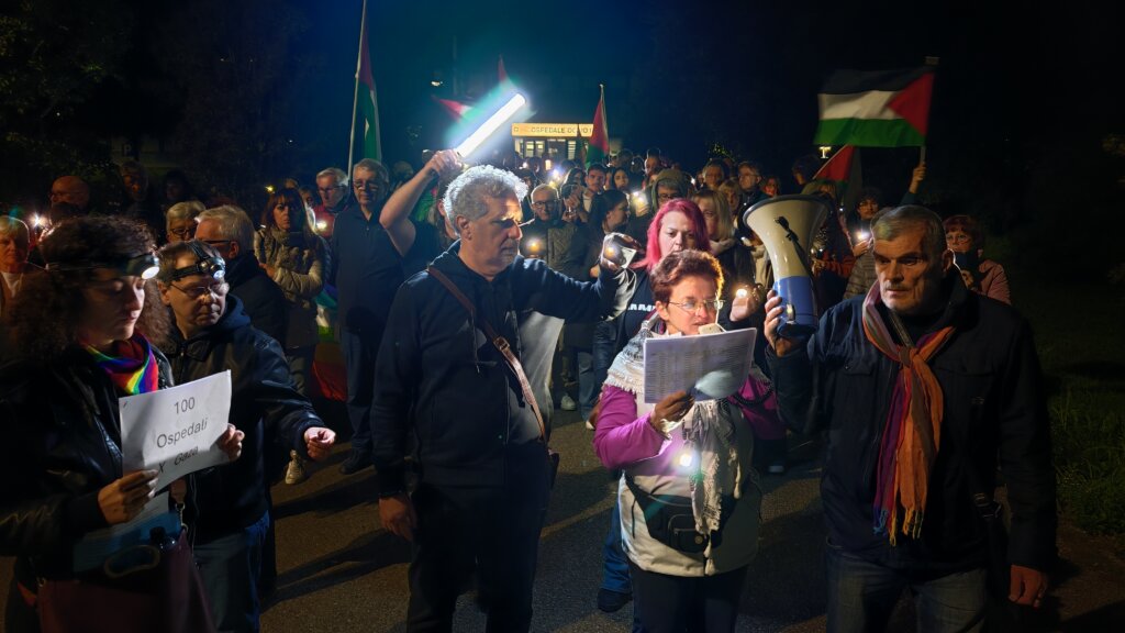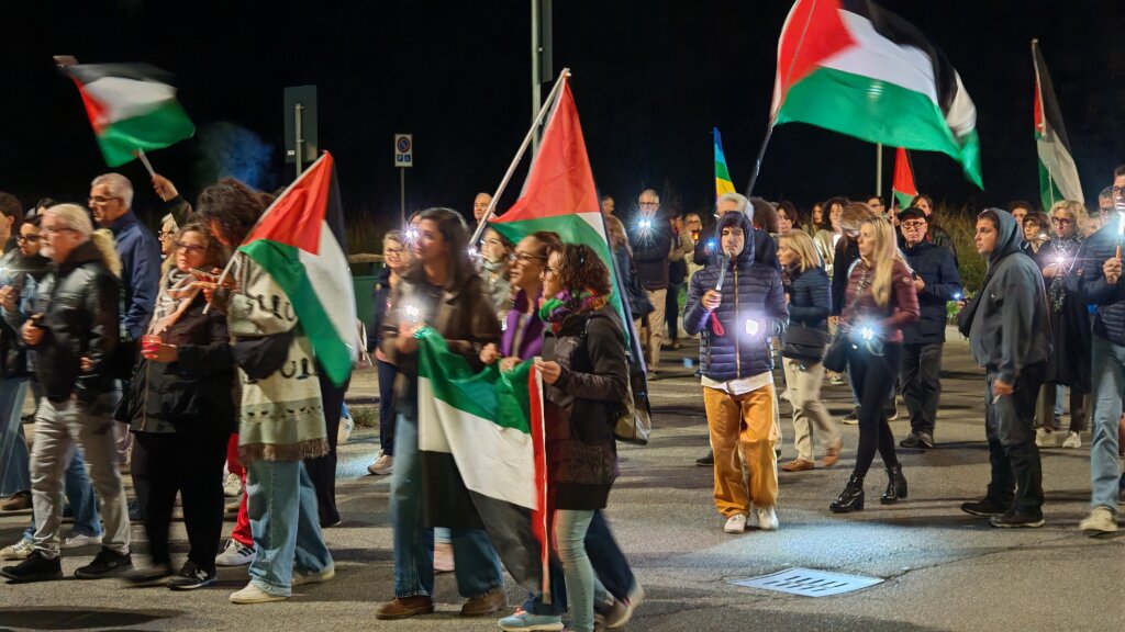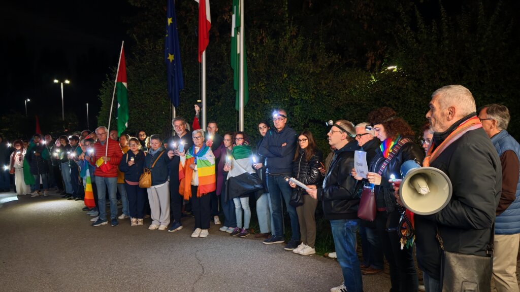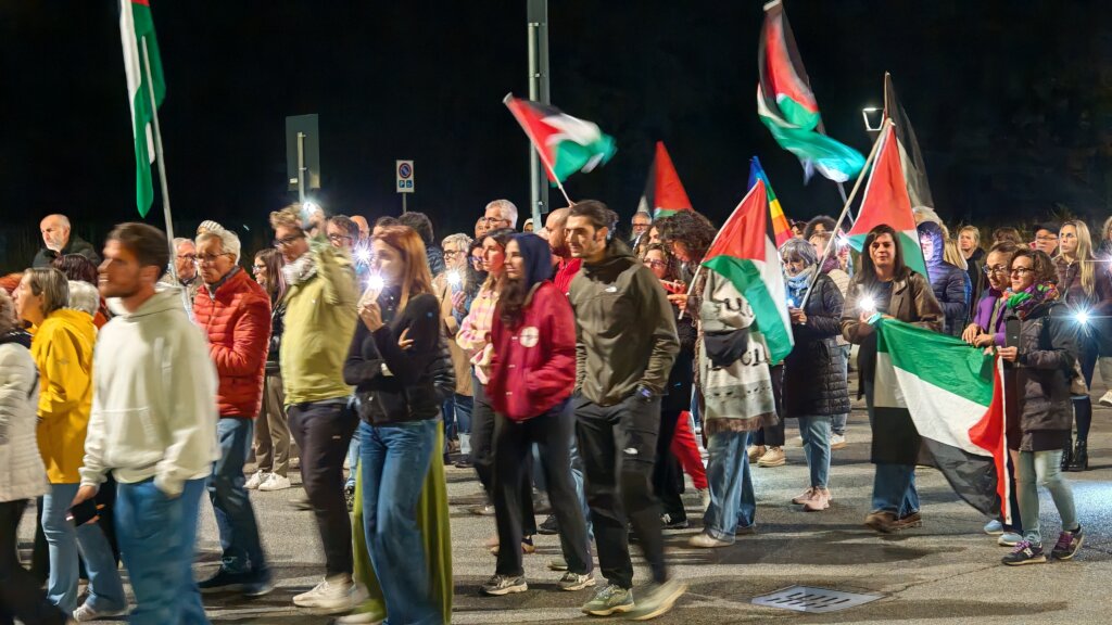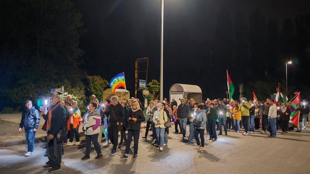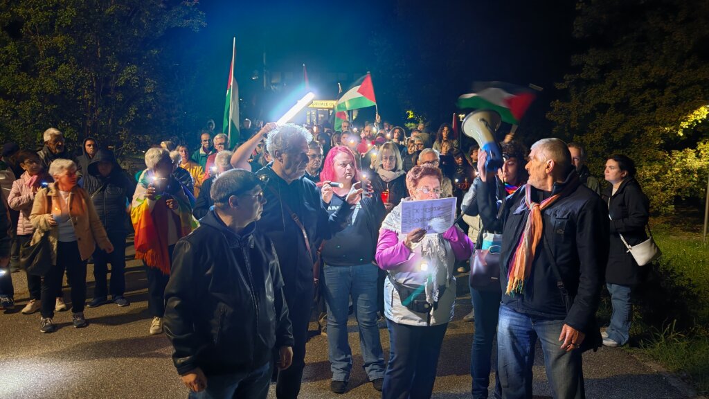 La manifestazione era stata programmata da qualche giorno: il caso (o meglio la cronaca) ha voluto che venisse realizzata proprio poche ore dopo lo stop imposto – in acque internazionali – alla Global Sumud Flottilla, con una cinquantina di imbarcazioni che volevano portare aiuti a Gaza ma sono state fermate dai militari israeliani. Ciascuno ha fatto luce come è riuscito: con torce, con un cellulare, con caschetti da minatore adattati per l’occasione.