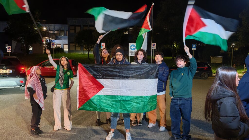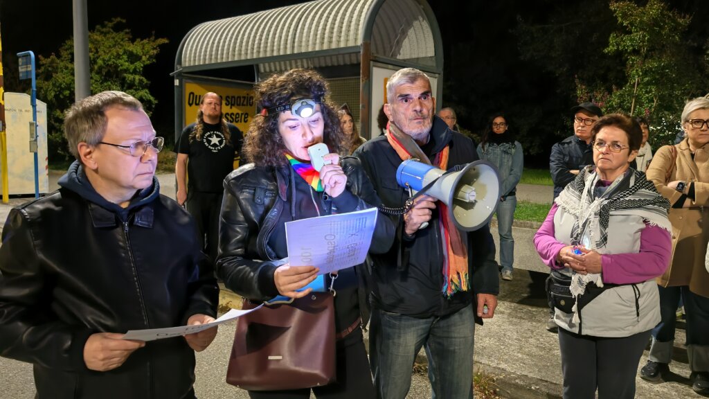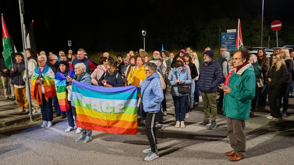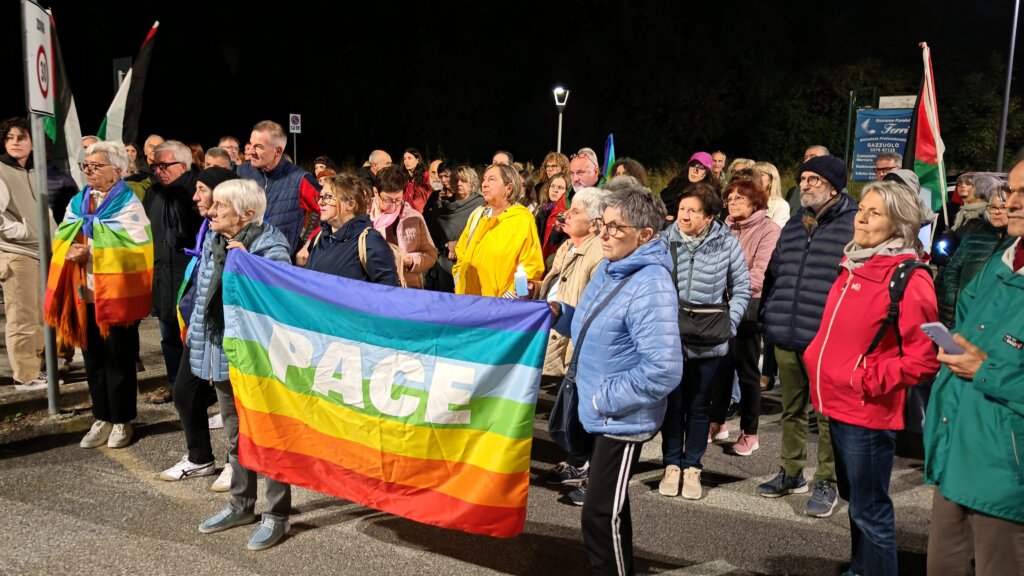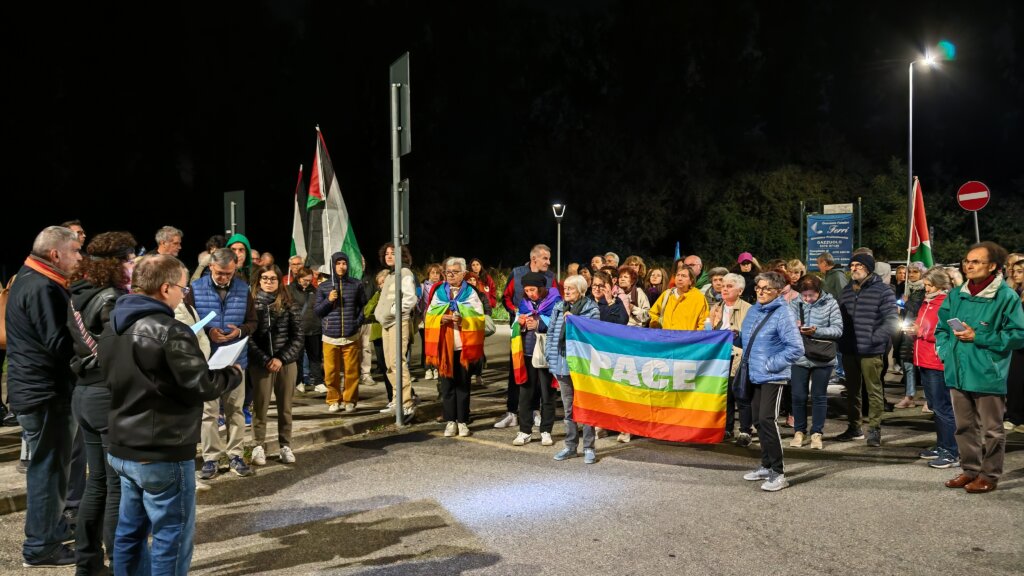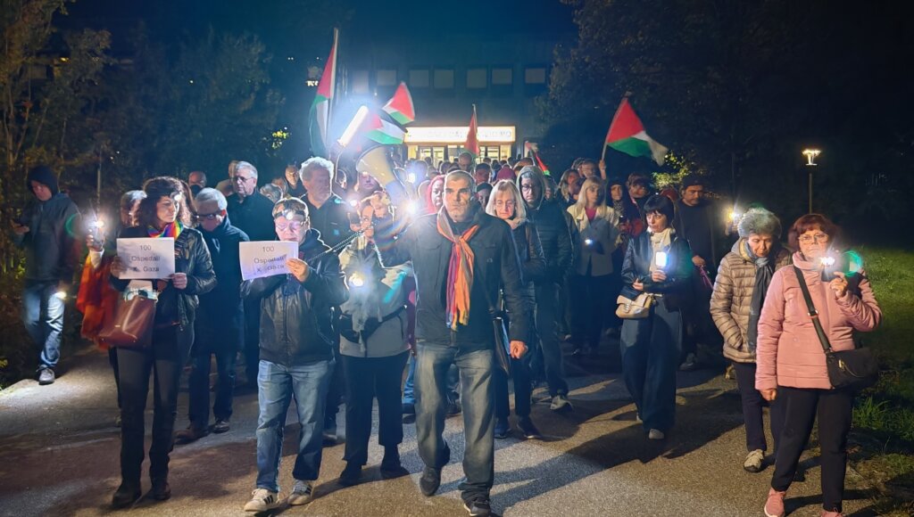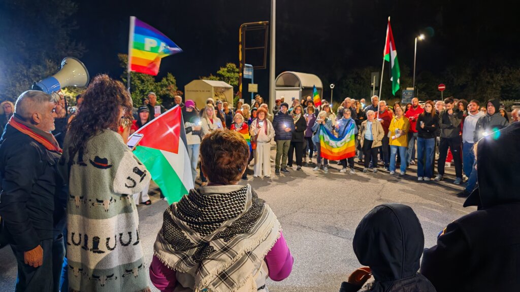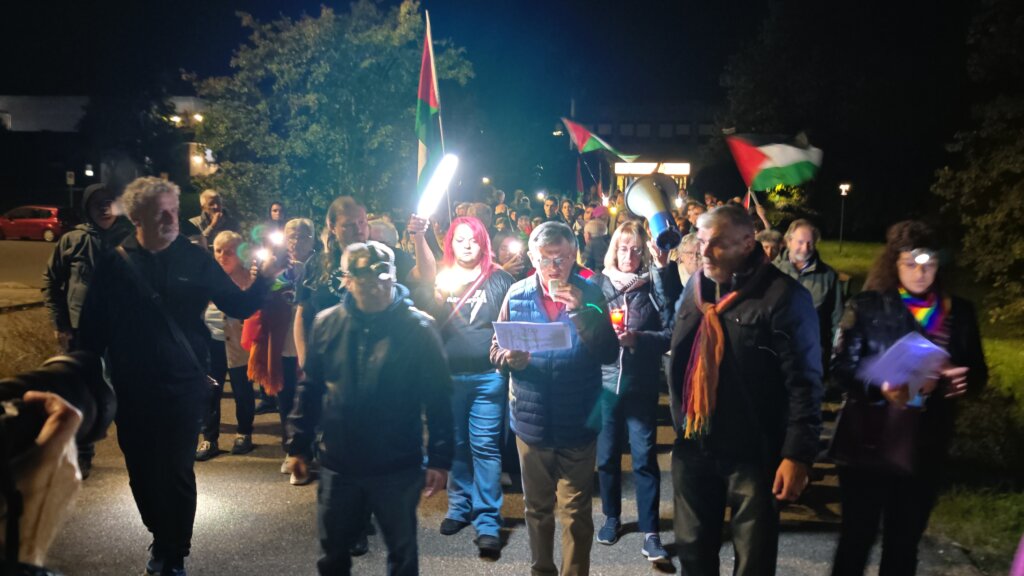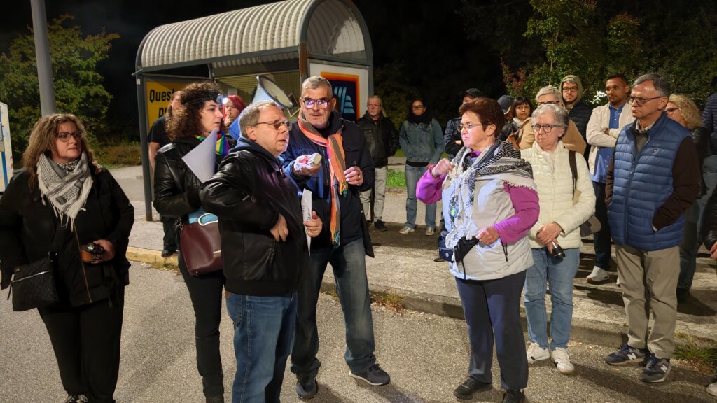La manifestazione era stata programmata da qualche giorno: il caso (o meglio la cronaca) ha voluto che venisse realizzata proprio poche ore dopo lo stop imposto – in acque internazionali – alla Global Sumud Flottilla, con una cinquantina di imbarcazioni che volevano portare aiuti a Gaza ma sono state fermate dai militari israeliani. Ciascuno ha fatto luce come è riuscito: con torce, con un cellulare, con caschetti da minatore adattati per l’occasione.
