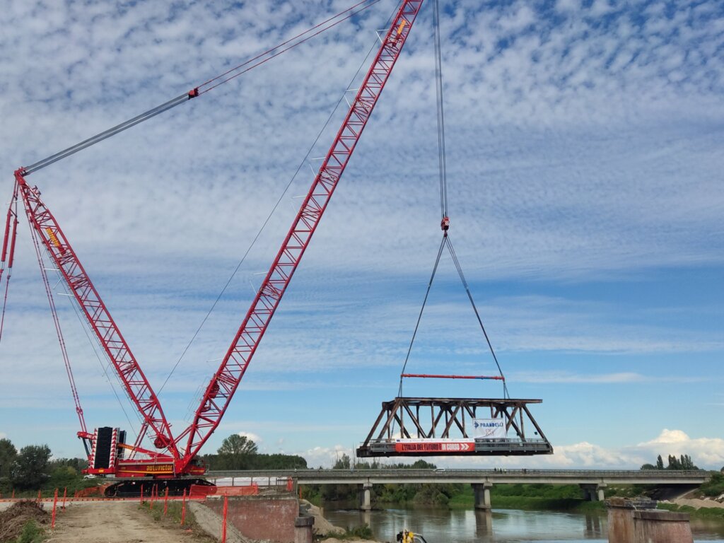 “Ogni dettaglio, ogni movimento delle gru – precisano i responsabili dell’intervento – è stato studiato e verificato in precedenza con modelli 3D ottenuti dal rilievo laser scanner della struttura. I pesi sono stati calcolati, incrementati con margini di sicurezza del 25% e ricontrollati in tempo reale. Il piano operativo ha visto il via, mercoledì 24 settembre, dalla campata laterale C1, quella sul lato Bozzolo. La campata, circa 137 tonnellate di acciaio, è stata imbragata, staccata dall’impalcato e depositata nell’area di cantiere predisposta per il calo a terra.
