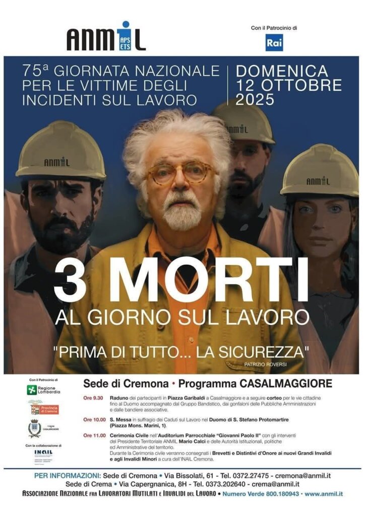 Un parametro sul quale riflettere e che restituisce l’importanza di momenti di sensibilizzazione, occasioni di confronto su una problematica così pressante e sulla necessità di una maggiore sicurezza sul lavoro. L’iniziativa, che si terrà a Casalmaggiore e in diverse città e centri in tutta Italia domenica 12 ottobre, è patrocinata da Regione Lombardia, Provincia di Cremona, Comune di Casalmaggiore e Rai, ed è realizzata in collaborazione con Inail Dir. Terr. Mn-Cr Sede Cremona.