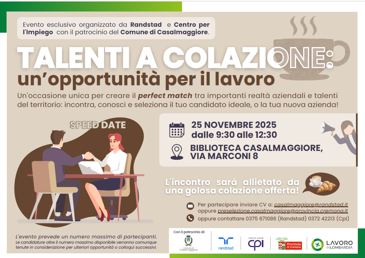 Un evento esclusivo organizzato da Randstad Casalmaggiore e dal Centro per l’Impiego di Casalmaggiore, con il patrocinio del Comune di Casalmaggiore.