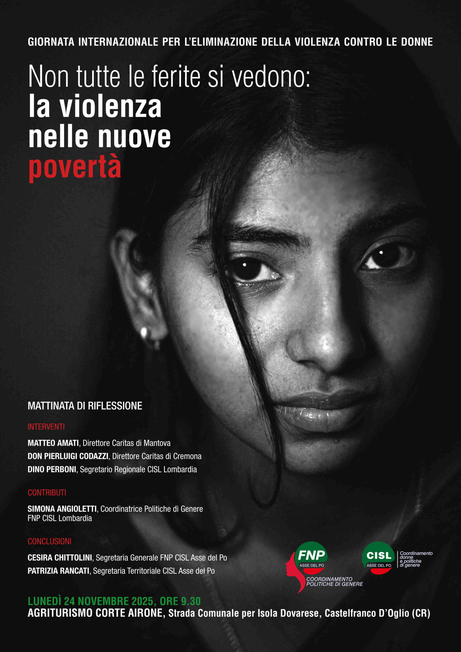 Lunedì 24 novembre 2025, alle 9.30, all’Agriturismo Corte Airone di Castelfranco d’Oglio – Drizzona, i Coordinamenti Donne e Politiche di Genere della Cisl Asse del Po, rappresentati da Giusy Amadasi e Valentina Cherubini, organizzano l’incontro: “Non tutte le ferite si vedono: la violenza nelle nuove povertà”.