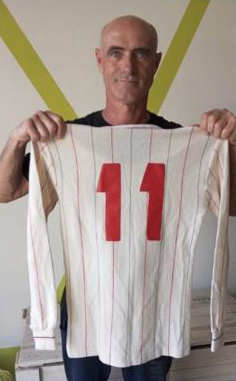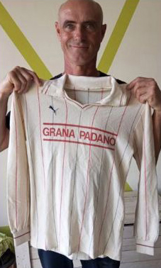 Quella maglietta, praticamente intatta, è un pezzo assolutamente unico. Era la cosiddetta casacca da trasferta, quella bianca con le righe grigie e rosse sottili, realizzata in cotone con le maniche lunghe (allora la muta invernale era così). Tiziano Bordi ha avuto una lunga e importante carriera nel calcio dilettantistico emiliano, arrivando a sfiorare anche il professionismo visto che, per qualche mese, in gioventù, aveva militato con la Primavera del Parma.