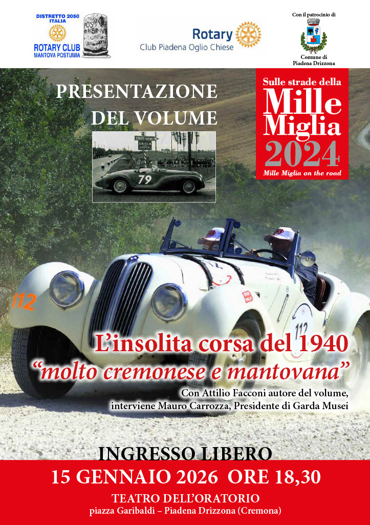 L’incontro, aperto a tutta la cittadinanza e promosso dai Club Rotary Piadena Oglio-Chiese e Mantova Postumia, vedrà la partecipazione di Federica Ferrari, sindaco di Piadena Drizzona, ente che ha concesso il patrocinio, e di Mauro Carrozza, presidente di Garda Musei, che dialogherà con l’autore. Nel corso della serata, a ingresso libero, saranno proiettate fotografie storiche del 1940 e alcune immagini di grande effetto scenografico della corsa di regolarità.