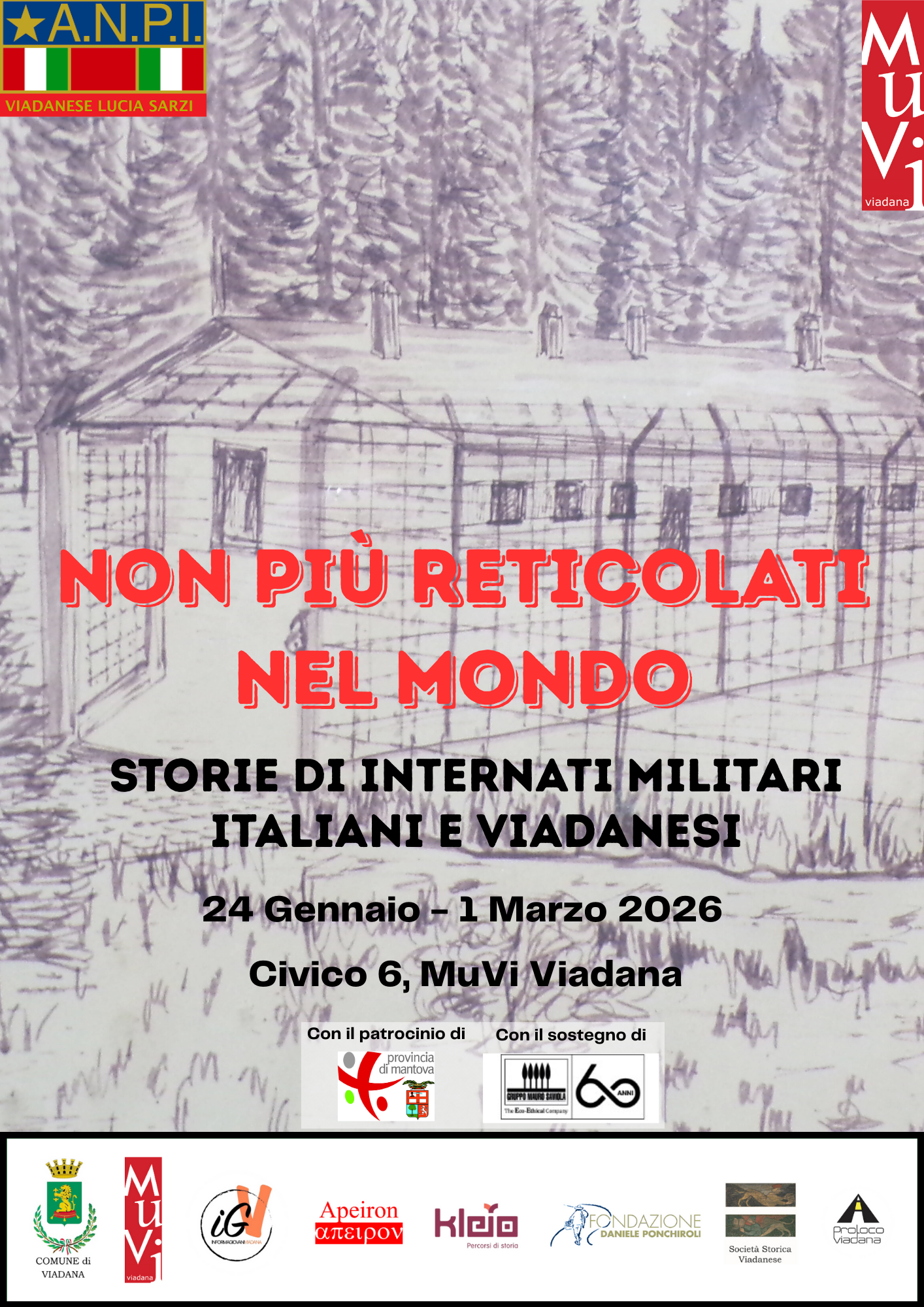 Dal 24 gennaio al 1° marzo 2026 il MuVi di Viadana, nella sala Civico 6, ospita la mostra “Non più reticolati nel mondo. Storie di internati militari italiani e viadanesi”, a cura del Comune di Viadana, del MuVi e di ANPI Viadanese “Lucia Sarzi”, con il patrocinio della Provincia di Mantova.