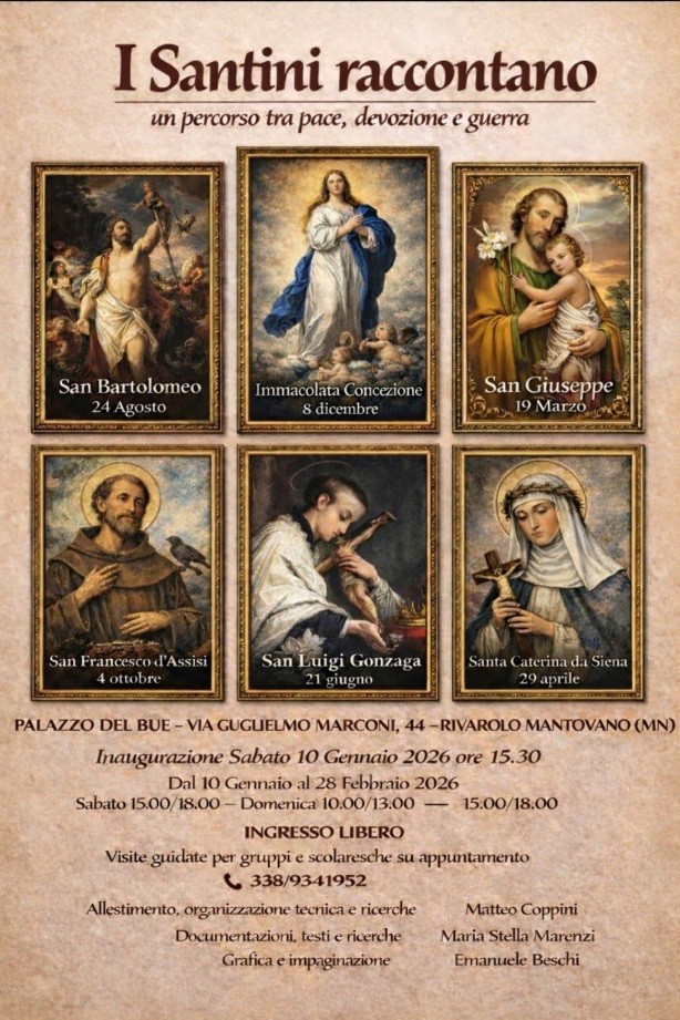 Tutto questo è contenuto in una mostra in terra mantovana, che “parla” cremonese, dal titolo “I Santini raccontano – un percorso tra pace, devozione e guerra” che si sta svolgendo al Palazzo del Bue di via Guglielmo Marconi, 44 a Rivarolo Mantovano, aperta al pubblico nei giorni di sabato dalle 15 alle 18 e domenica dalle 10 alle 13 e dalle 15. Alle 18, visitabile sino al 28 febbraio con ingresso gratuito.