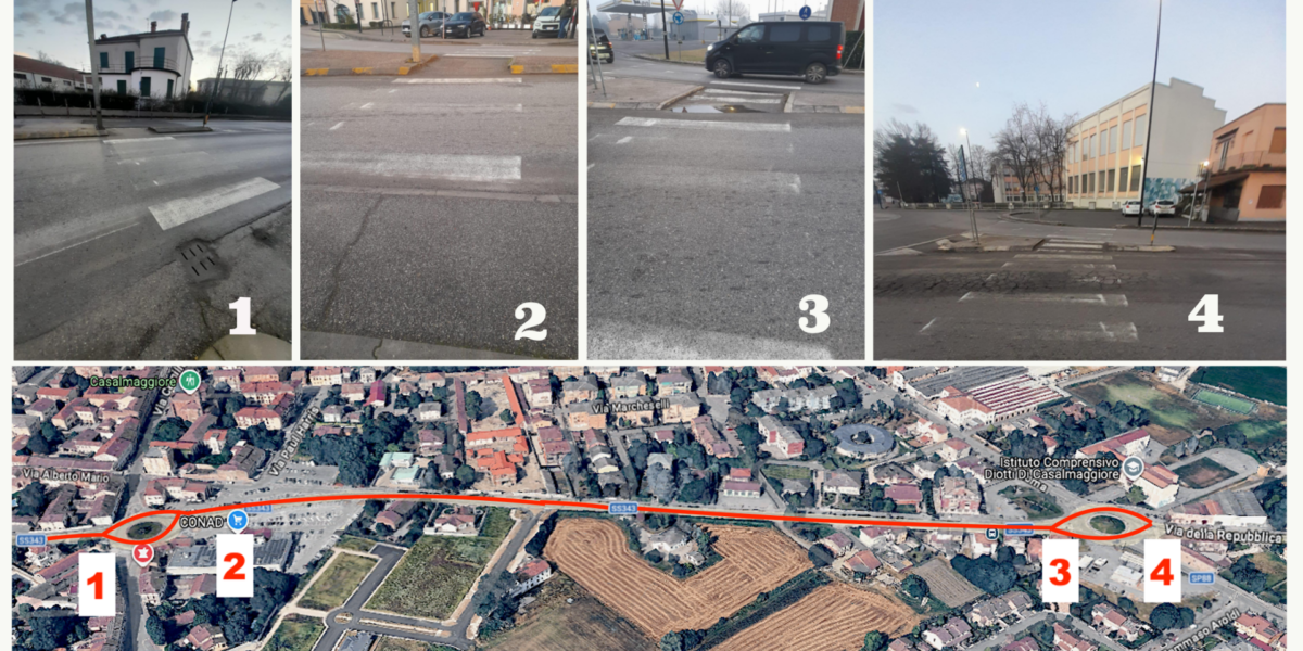 In merito alle competenze: “Chi ci deve pensare? A chi tocca tutto ciò? Dividiamo pani e pesci; il Comune di Casalmaggiore per segnaletica orizzontale, verticale, messa in sicurezza degli attraversamenti all’interno del centro abitato, revisione del PUT (Piano Urbano del Traffico). Sicuramente Anas per quanto concerne asfalti e manutenzione del manto stradale e opere strutturali. E la Provincia, ad esempio, potrebbe occuparsi seriamente del tratto extraurbano che porta all’innesto della strada bassa per Vicomoscano sulla SS Sabbionetana; in quel punto, tanti pedoni e ciclisti attraversano pericolosamente per arrivare al Centro Commerciale e, negli anni passati, si sono già verificati gravissimi incidenti mortali.