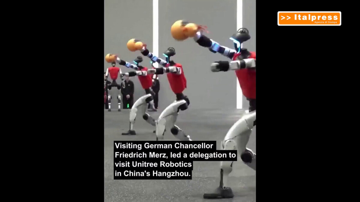 Il cancelliere tedesco Friedrich Merz ha visitato a Hangzhou l’azienda cinese di robot umanoidi Unitree Robotics e ha assistito a esibizioni di pugilato e arti marziali dei robot. (XINHUA/ITALPRESS) mec/abr/ (Fonte video: Xinhua)