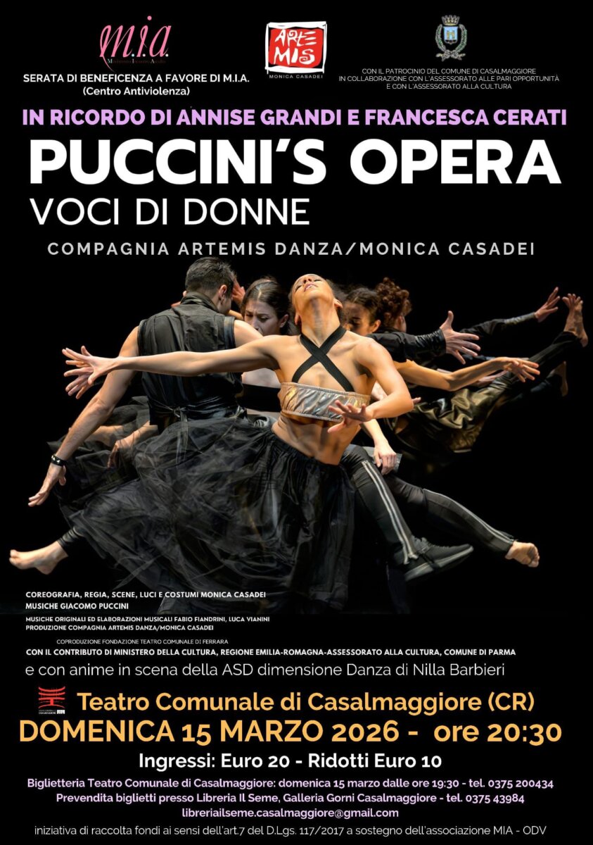 Voci di donne. Quelle di quattro eroine del compositore Giacomo Puccini: Tosca, Madama Butterfly, Mimì e Turandot. Voci che risuoneranno in Puccini’s Opera, spettacolo della Compagnia di danza contemporanea Artemis Danza, realizzato in collaborazione con l’Associazione MIA, in programma il 15 marzo alle 20.30 al Comunale.