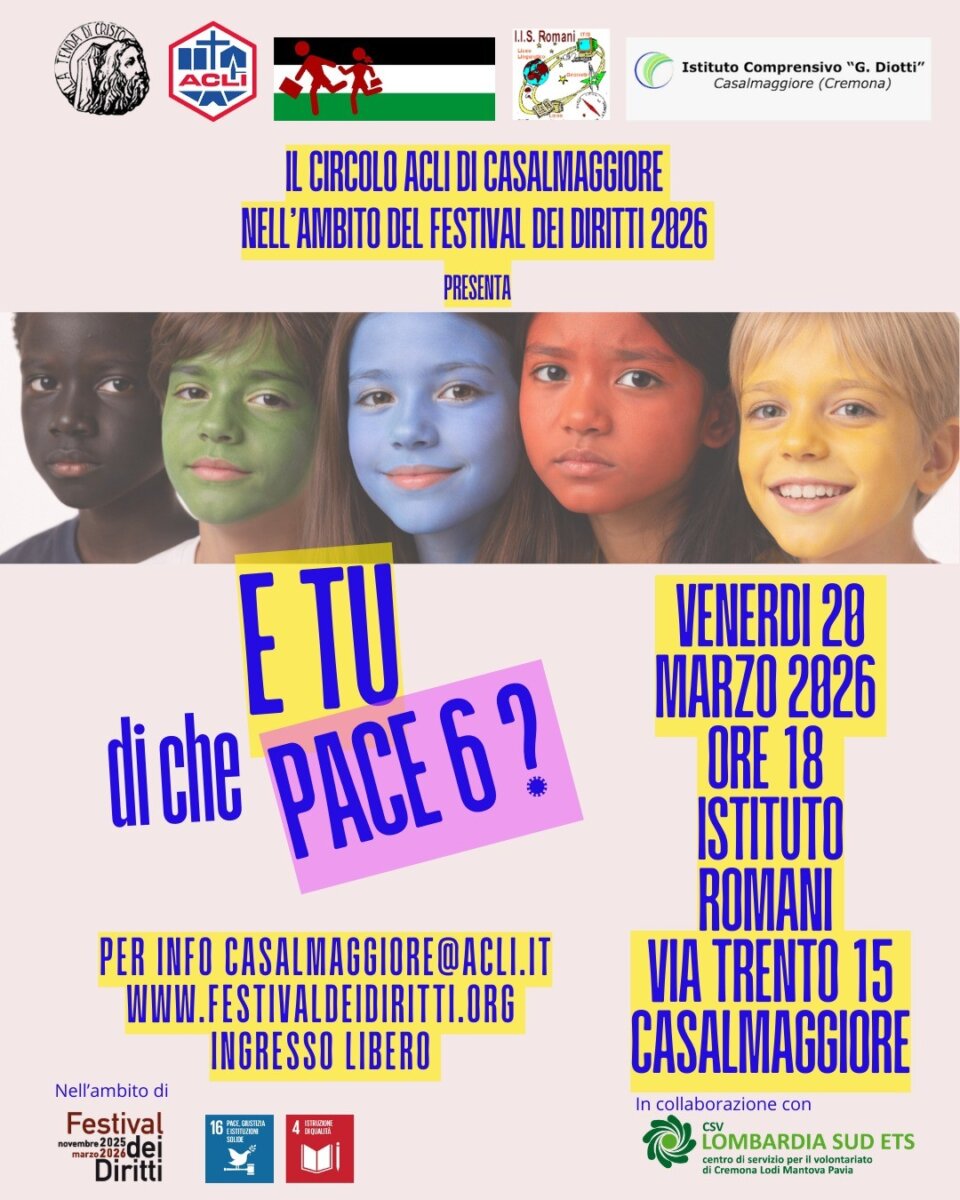 “E tu, di che pace 6?”: è il titolo dell’incontro pubblico in programma venerdì 20 marzo alle ore 18 nell’aula magna dell’Istituto di Istruzione Secondaria “G. Romani” di Casalmaggiore, in via Trento 15. L’iniziativa, inserita nell’ambito del Festival dei Diritti 2026, è promossa dal Circolo ACLI di Casalmaggiore.