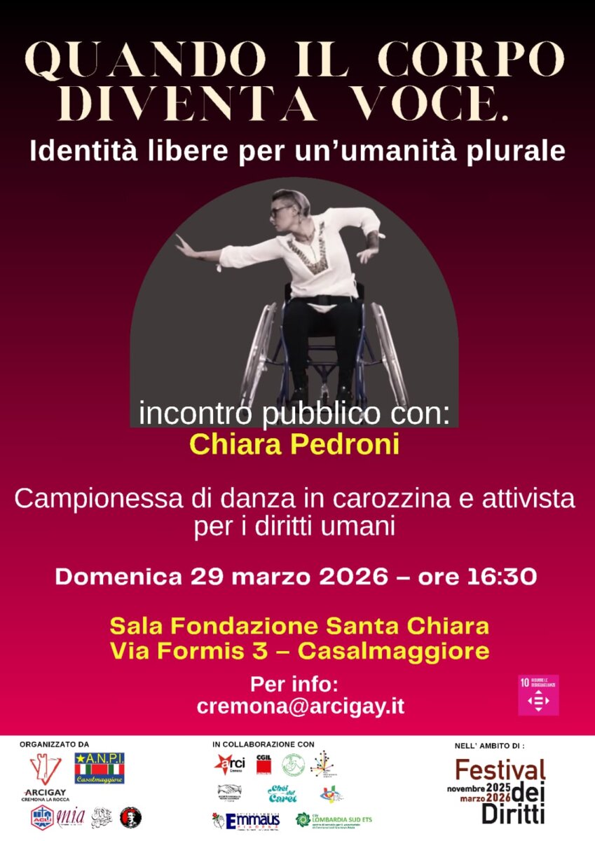 “Quando il corpo diventa voce. Identità libere per un’umanità plurale” è il titolo dell’incontro in programma domenica 29 marzo alle 16:30 presso la Sala dellaFondazione Santa Chiara di Casalmaggiore. L’appuntamento, promosso nell’ambito del Festival dei Diritti CSV Cremona – Lombardia Sud, vedrà come ospite Chiara Pedroni, in dialogo con la giornalista di CR1 e Cremonaoggi Laura Bosio, che modererà l’evento.