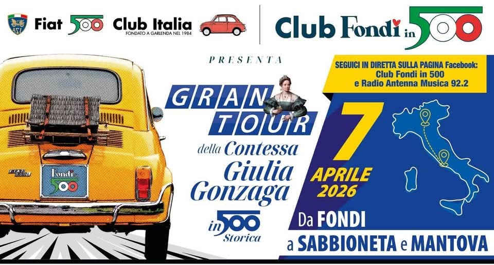 L’evento vedrà la partecipazione di una delegazione proveniente dalla città di Fondi, che raggiungerà Sabbioneta a bordo di iconiche Fiat 500, con circa 15 equipaggi coinvolti