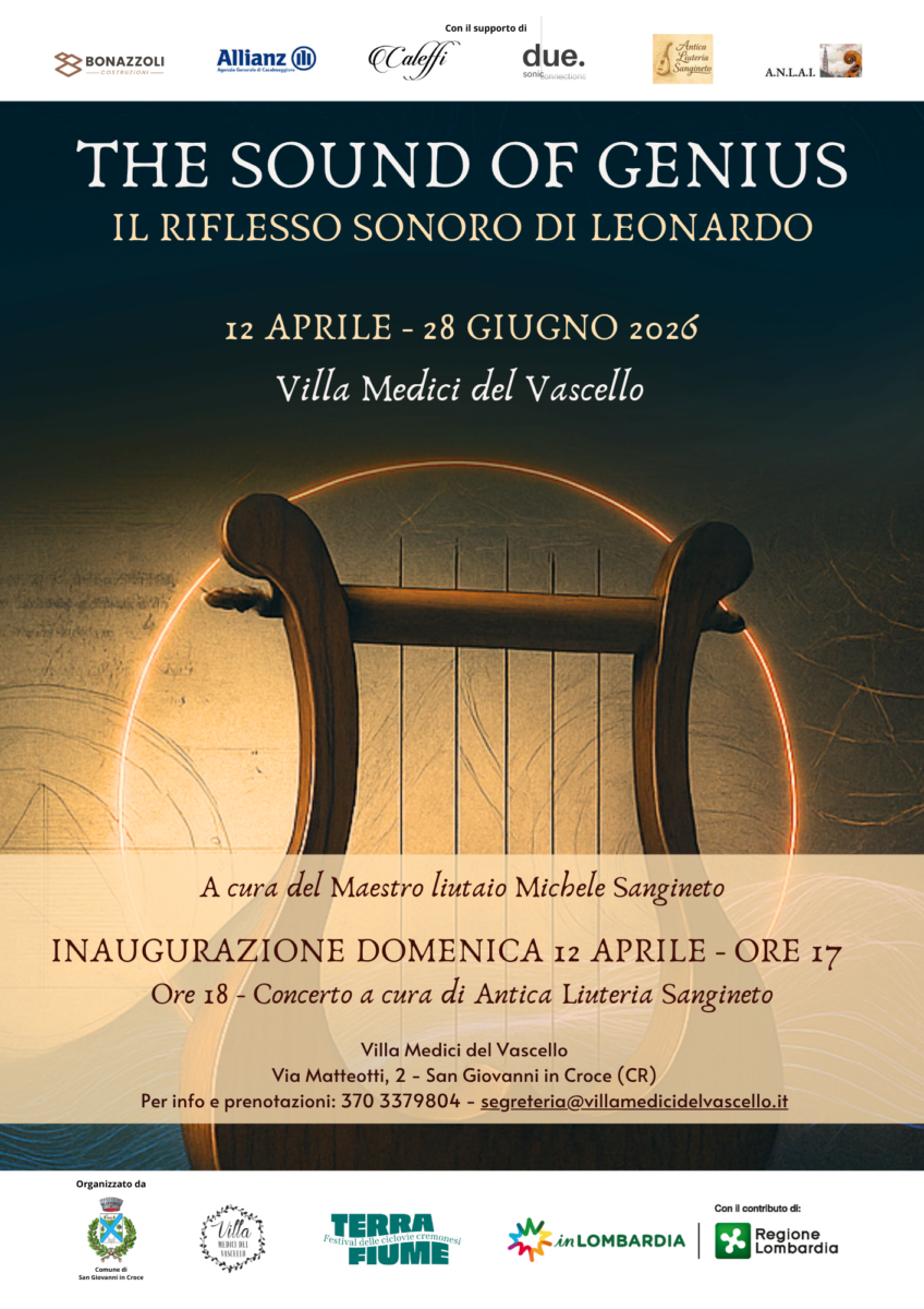Il Comune di San Giovanni in Croce conferma il proprio ruolo di primo piano, nel contesto culturale del territorio, con una mostra destinata a suscitare notevole interesse. Infatti, gli eleganti spazi di Villa Medici del Vascello ospiteranno la mostra “The Sound of Genius. Il riflesso sonoro di Leonardo”. Il percorso espositivo – che inaugurerà domenica 12 aprile alle 17 è un viaggio che racconta uno degli aspetti meno noti, ma al contempo, più affascinanti del genio di Vinci: la sua dedizione alla musica e all’acustica.