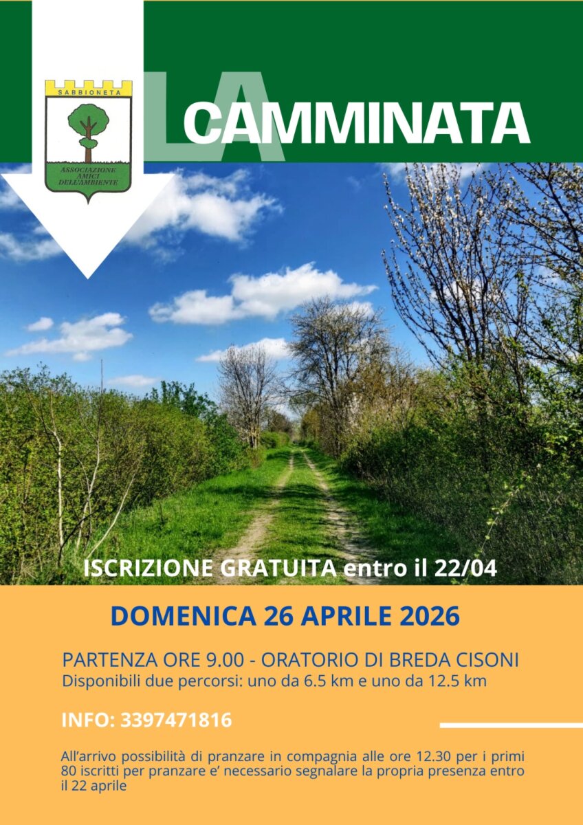 La proposta è pensata per essere accessibile a tutti, con due itinerari di 6,5 e 12,5 chilometri, adatti sia alle famiglie sia agli appassionati di camminate nella natura. La partenza è fissata alle ore 9 dall’Oratorio di Breda Cisoni; la partecipazione è gratuita, con iscrizione entro il 22 aprile. Al termine, sarà possibile fermarsi per un pranzo in compagnia, su prenotazione.